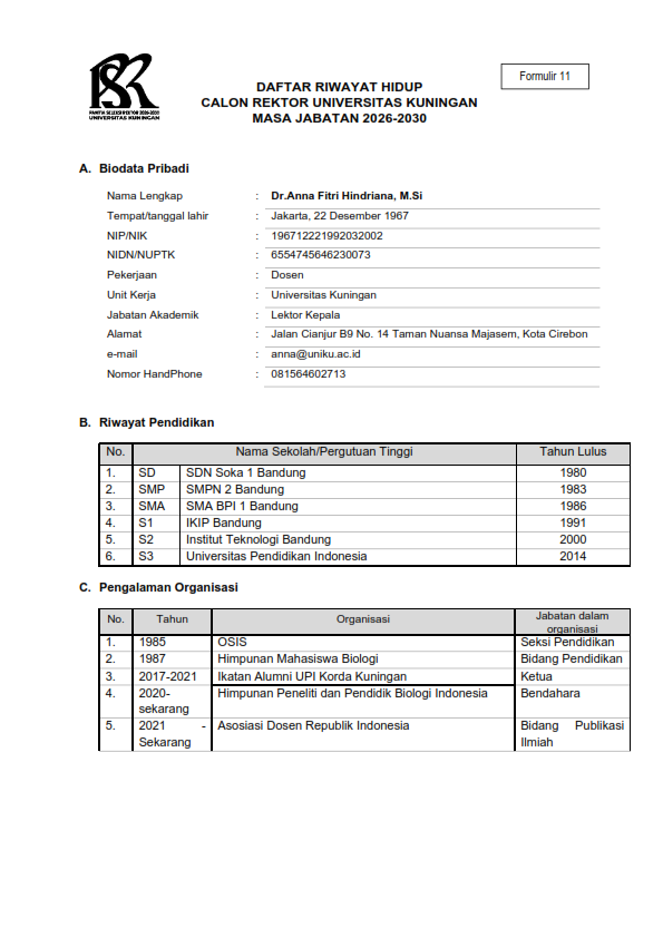 Siapa sosok Dr Anna Fitri Hindriana MSi, pengganti Rektor Uniku 2 periode Prof Dr H Diikdik Harjadi MSi, yang habis masa jabatan. Berikut profilnya: