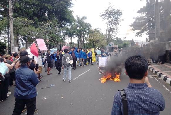 Aksi mereka memanas, menyusul terjadi pembakaran ban. Asap tebal pun mengepul, mengakibatkan arus Jalan Raya Siliwangi depan Kantor Bupati Kuningan dialihkan memutar ke Komplek Stadion Mashud Wishnusaputra.