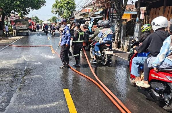 Petugas Damkar menegaskan, jika tidak segera ditangani, tumpahan semen tersebut berpotensi menimbulkan gangguan kesehatan seperti sesak napas bagi pengguna jalan maupun warga sekitar./Handy