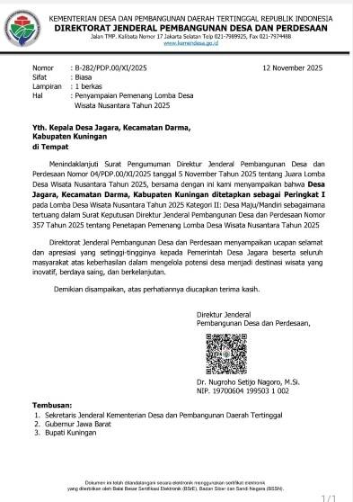 INILAHKUNINGAN- Desa Jagara, Kecamatan Darma, Kabupaten Kuningan, resmi meraih Juara 1 Nasional Lomba Desa Wisata Nusantara (LDWN) 2025 kategori