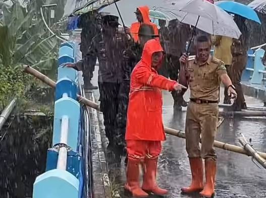 INILAHKUNINGAN- Luapan air sungai tiada henti akibat intensitas hujan tinggi setiap hari, menyebabkan pondasi beton jembaan tua Desa Cijemit,